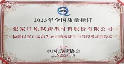 2023年12月,張家口原軾新型材料股份有限公司憑借 “構建以客戶需求為導向的敏捷質量管控模式的經驗”,榮獲2023年全國質量標桿企業。